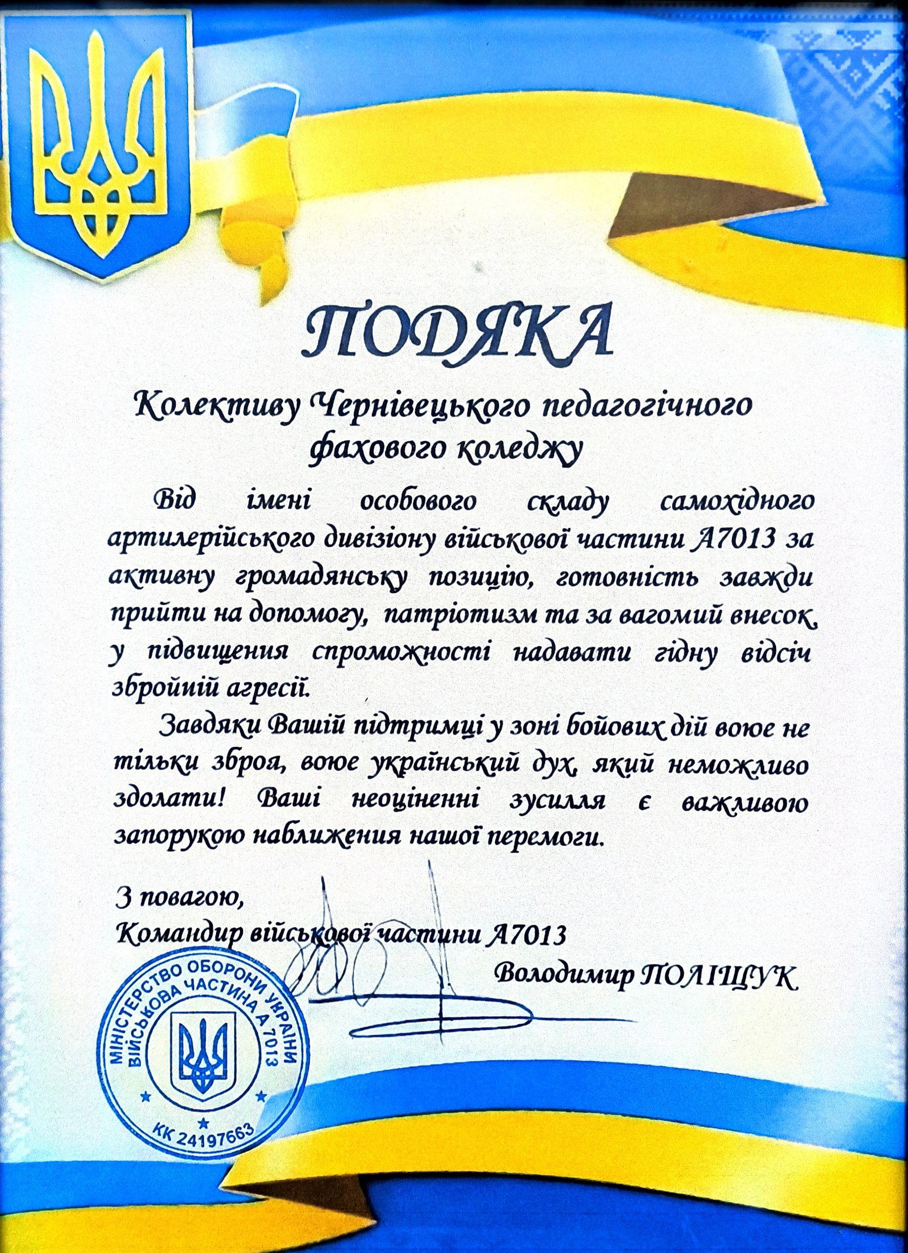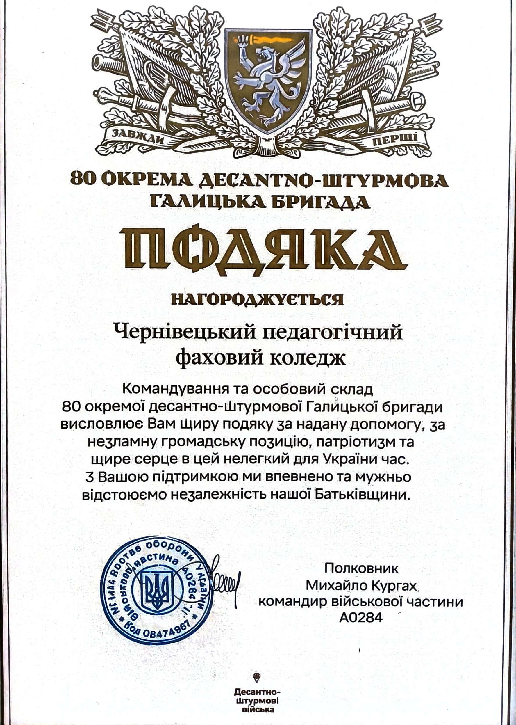 За допомогу Збройним силам України, “активну громадянську позицію, патріотизм та вагомий внесок у підвищення спроможності надавати гідну відсіч збройній агресії росії” командування 80 окремої десантно-штурмової Галицької бригади та самохідного артилерійського дивізіону військової частини А7013 відзначили колектив нашого коледжу ПОДЯКАМИ.