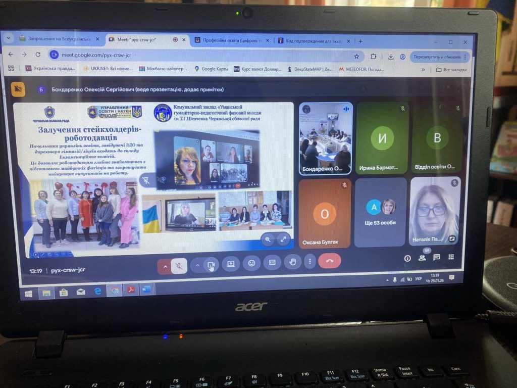 29 січня 2026 року директорка коледжу Палій Н.Т., заступниця з навчальної роботи Жук М.І., завідувачка навчально-виробничої практики Коптюк Л.А., в.о. завідувача дошкільного відділення Мотрук Н.М., голова циклової комісії викладачів педагогіки, психології та фахових методик дошкільної освіти Кошурба Л.О., керівник Центру працевлаштування студентів Бачинський Д.В. взяли участь у роботі Всеукраїнського круглого столу «Середовище можливостей для дітей дошкільного віку: розвиток, догляд і добробут крізь призму оновленого законодавства у сфері дошкільної освіти», проведеного Комунальним закладом «Уманський гуманітарно-педагогічний фаховий коледж ім. Т. Г. Шевченка Черкаської обласної ради».